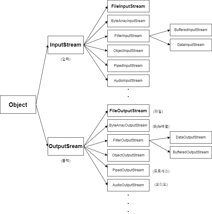 InputStream 및 OutputStream 클래스(추상)는 모든 바이트 스트림의 슈퍼 클래스이며,