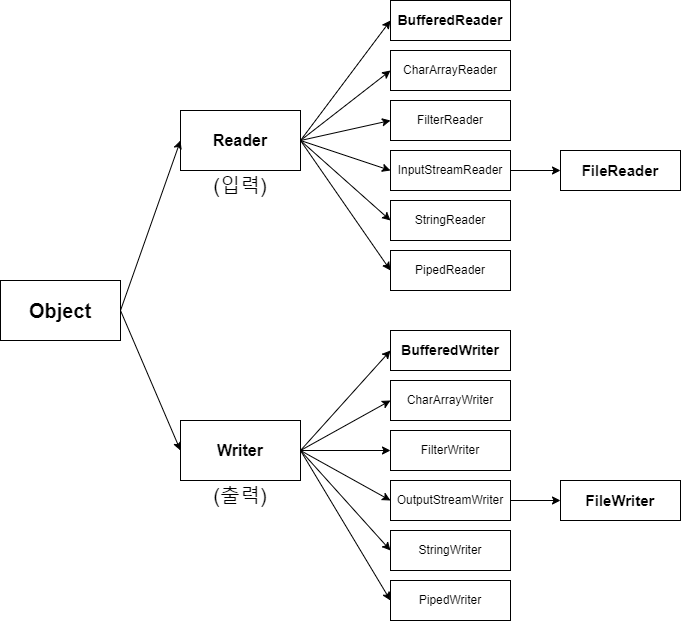 바이트 기반의 스트림은 ~In/Out Stream.class이며, 문자 기반의 스트림은 ~Read/Write er.class이다.